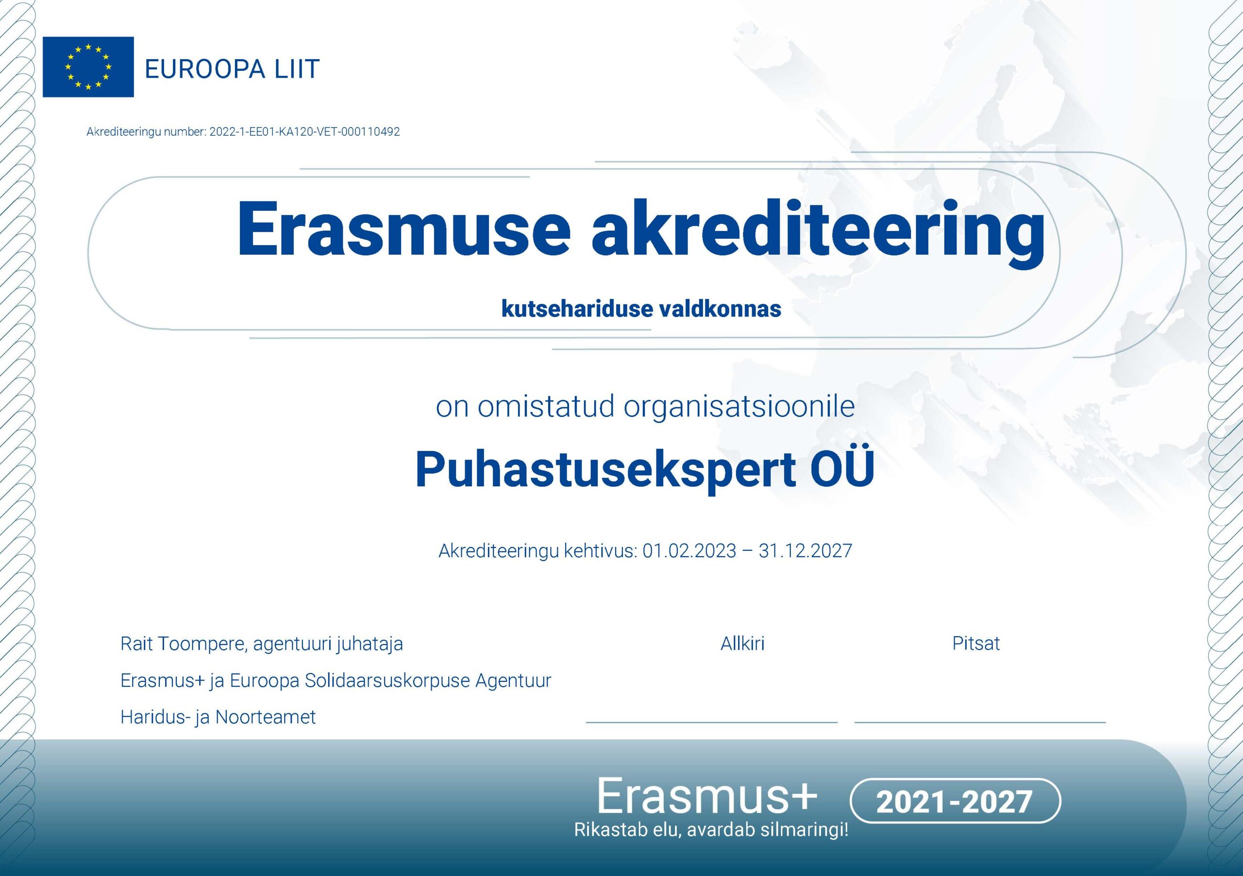 Puhastusekspert omistas Erasmus õpirände akrediteeringu konsortsiumina kutsehariduse valdkonnas, mille raames saab läbi viia õpirände projekte 2023-2027 aastatel konsortsiumi liikmetele.
